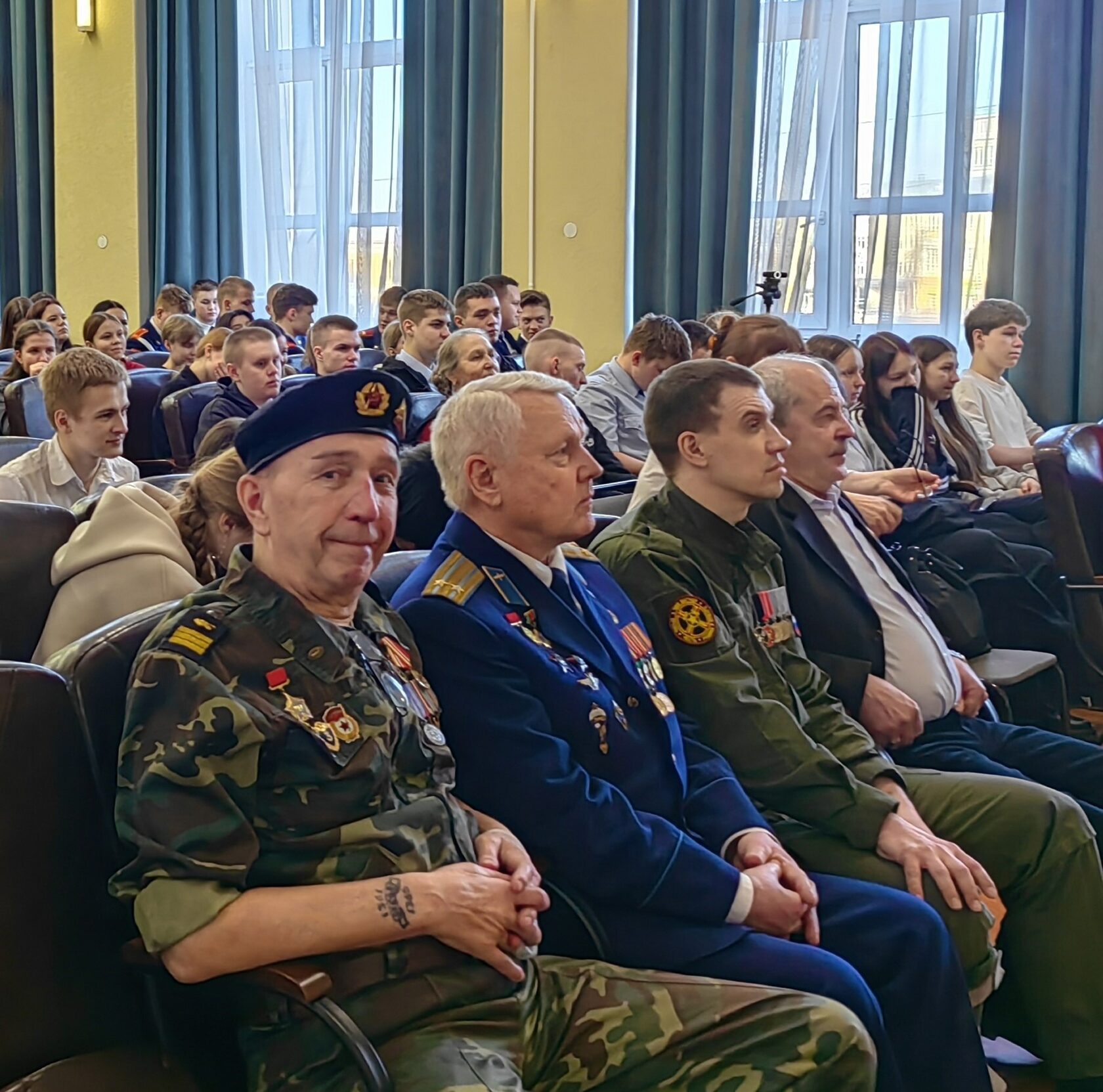 Своими воспоминаниями о военном быте, отношении местного населения к российским воинам, о полученных наградах поделились штурмовик отряда «Шторм» Министерства обороны РФ Виктор Борисович Коротков и ветеран боевых действий в составе ЧВК «Вагнер», вынесший с поля боя 30 человек как военный медик, Алексей Викторович Осолодкин, ставший наставником кадетов вологодской школы № 15 имени дважды Героя Советского Союза А.Ф. Клубова.