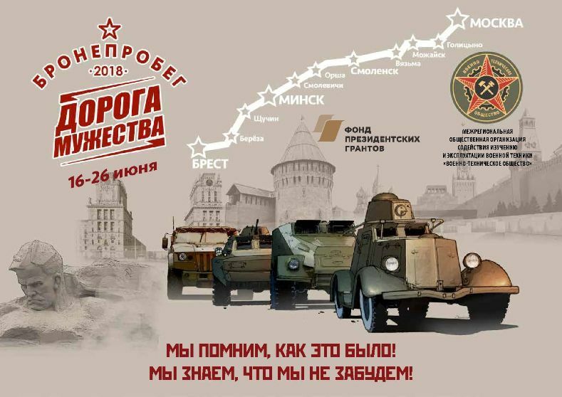 По инициативе межрегиональной общественной организации содействия изучению и эксплуатации военной техники «Военно-техническое общество» при поддержке Фонда президентских грантов с 16 по 26 июня 2018 года состоится Втором Международном бронепробег «Дорога мужества» по маршруту «Москва-Смоленск-Минск-Брест-Москва» под лозунгом «Мы помним, как это было! Мы знаем, что мы не забудем!», который будет проходить и приурочен к дате начала Великой Отечественной Войны