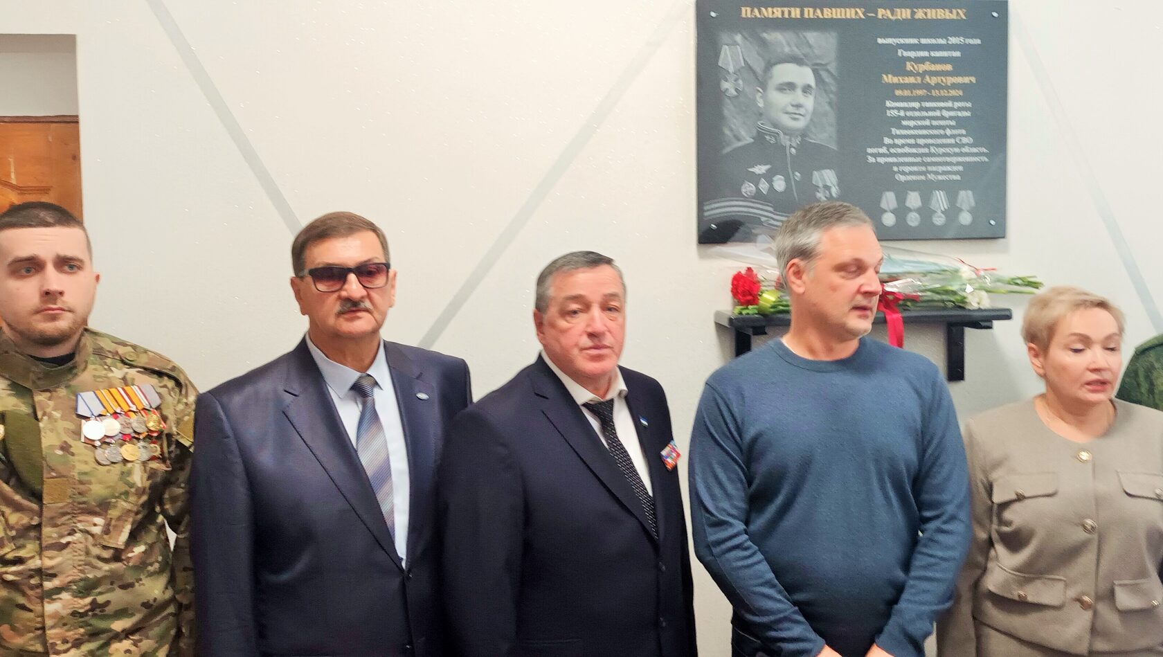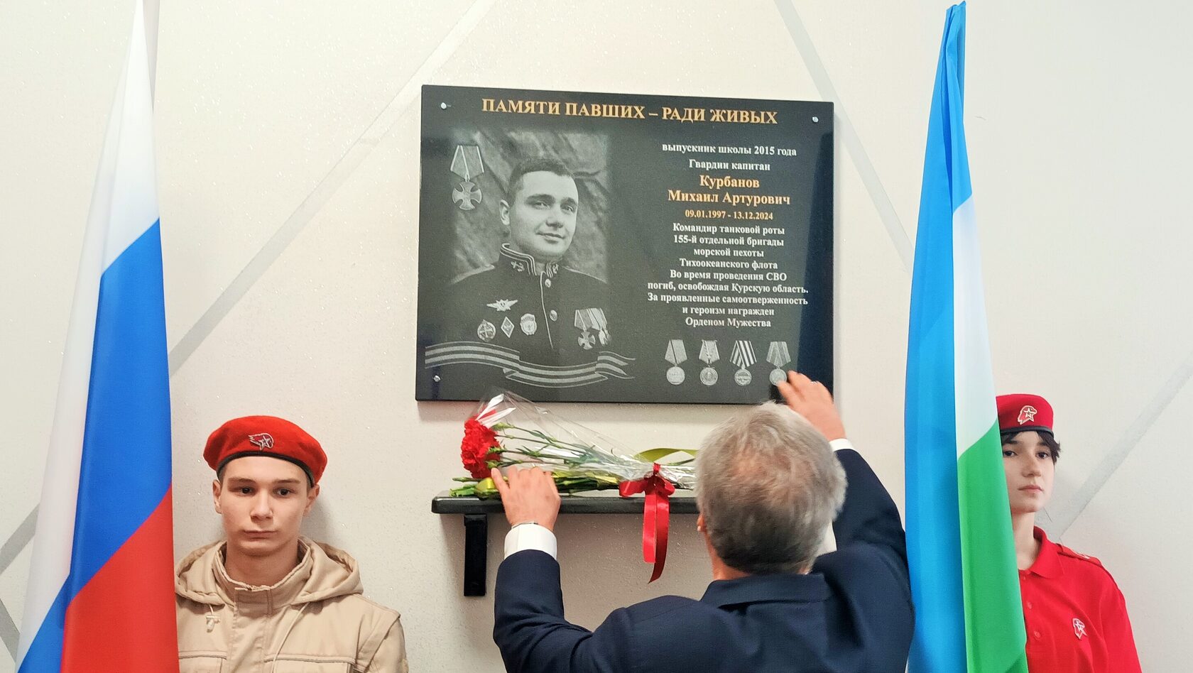 23.10.2025 в МКОУ «СОШ №9» была торжественно открыта мемориальная доска участнику СВО, гвардии капитану Михаилу Артуровичу Курбанову, награждённому орденом Мужества, посмертно.